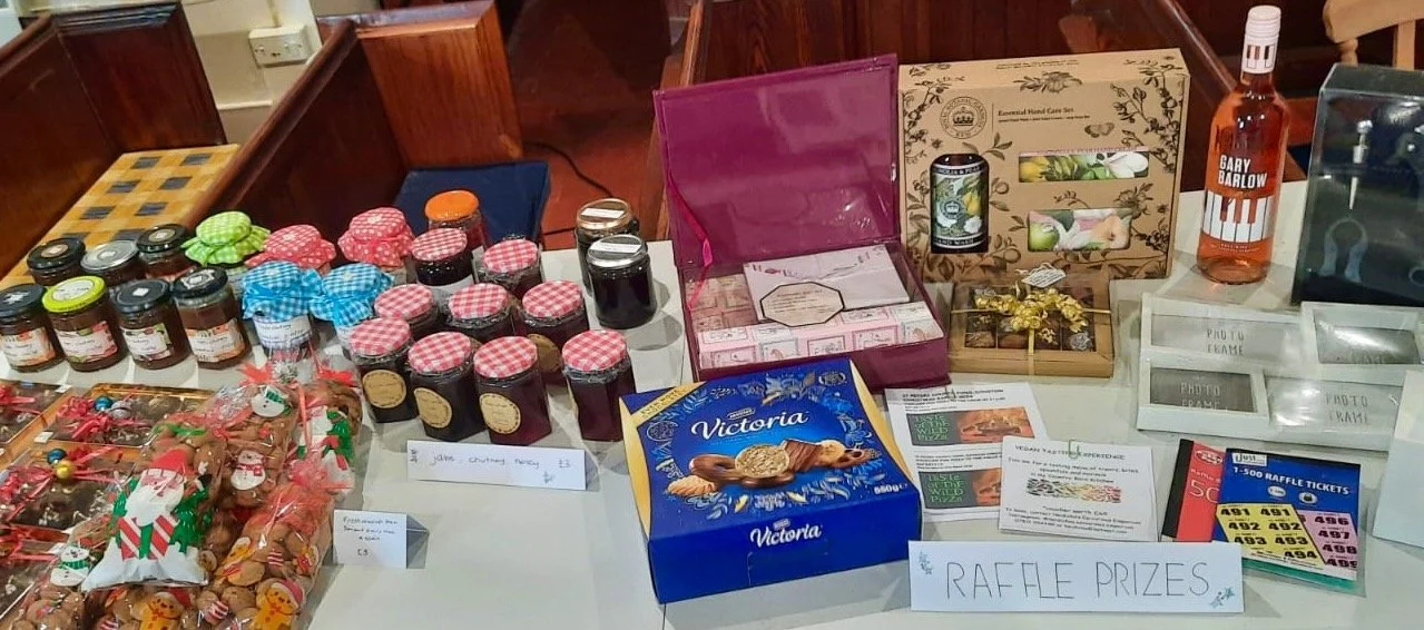 Coffee, mulled wine & mice pies and selling home maid goodies. All in aid of the church repair fund.